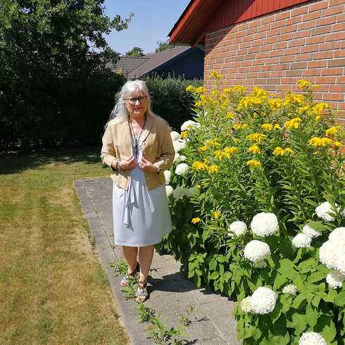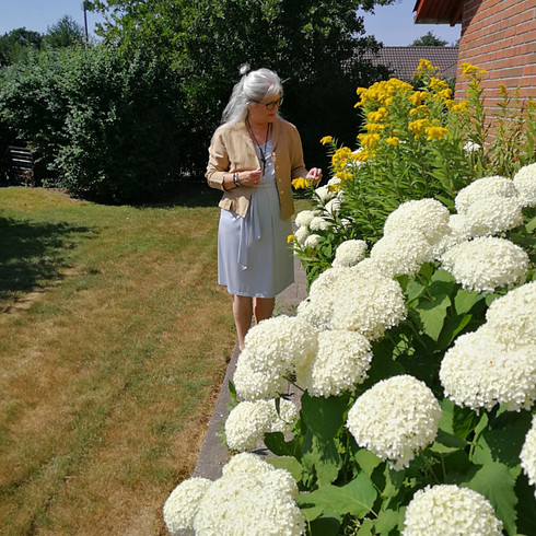 Den hvide Hortensia blomstrer smukt for øjeblikket. Ligeledes de gule blomster, som jeg ikke ved hvad hedder. Og græsset er jo efterhånden blevet ret gult pga. tørken.