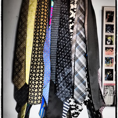 Jeg er ret fascineret af slips, og hvis jeg ser et smukt, blødt og lækkert slips i en genbrugsbutik, så kommer det hjem og pynter sammen med resten af slipsesamlingen. Jeg går ikke med dem. De hænger kun til pynt - indtil videre da. Men jeg har i flere år haft store planer med dem, uden at vide helt præcis hvilke planer. Det har jeg fundet ud af nu. Jeg har planer om at sy et patchwork-tørklæde i hånden af forskellige slips. Jeg har i min pure ungdom syet lidt patchwork - uden dog at have været super trænet i det. Men det blev efterhånden lagt på hylden, for så var der så mange andre gøremål (såsom arbejde) eller andet jeg kastede mig over. Men nu hvor jeg hverken arbejder, har små børn eller andet godt, så er der masser at tid til forskellige aktiviteter. Desuden har jeg en mand, der både kan bage, lave mad, støvsuge og slå græs. Derudover er han en rigtig handyman. Hvor heldigt!